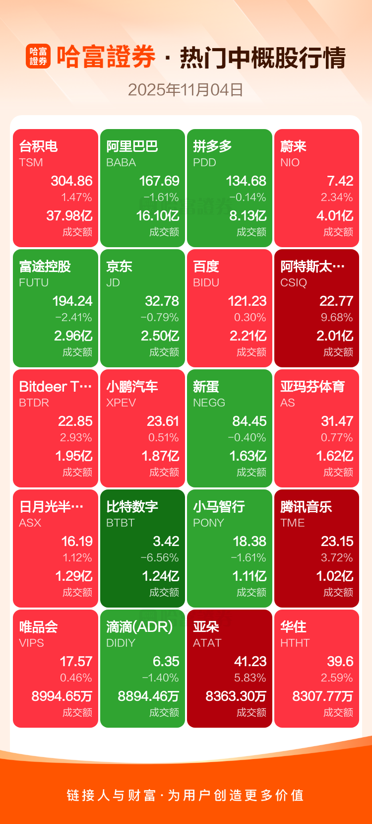 台积电涨1.47%,阿里巴巴跌1.61%,拼多多跌0.14%,蔚来涨2.34%,富途控股跌2.41%,京东跌0.79%,百度涨0.30%,阿特斯太阳能涨9.68%,Bitdeer Technologies Group-A涨2.93%,小鹏汽车涨0.51%。