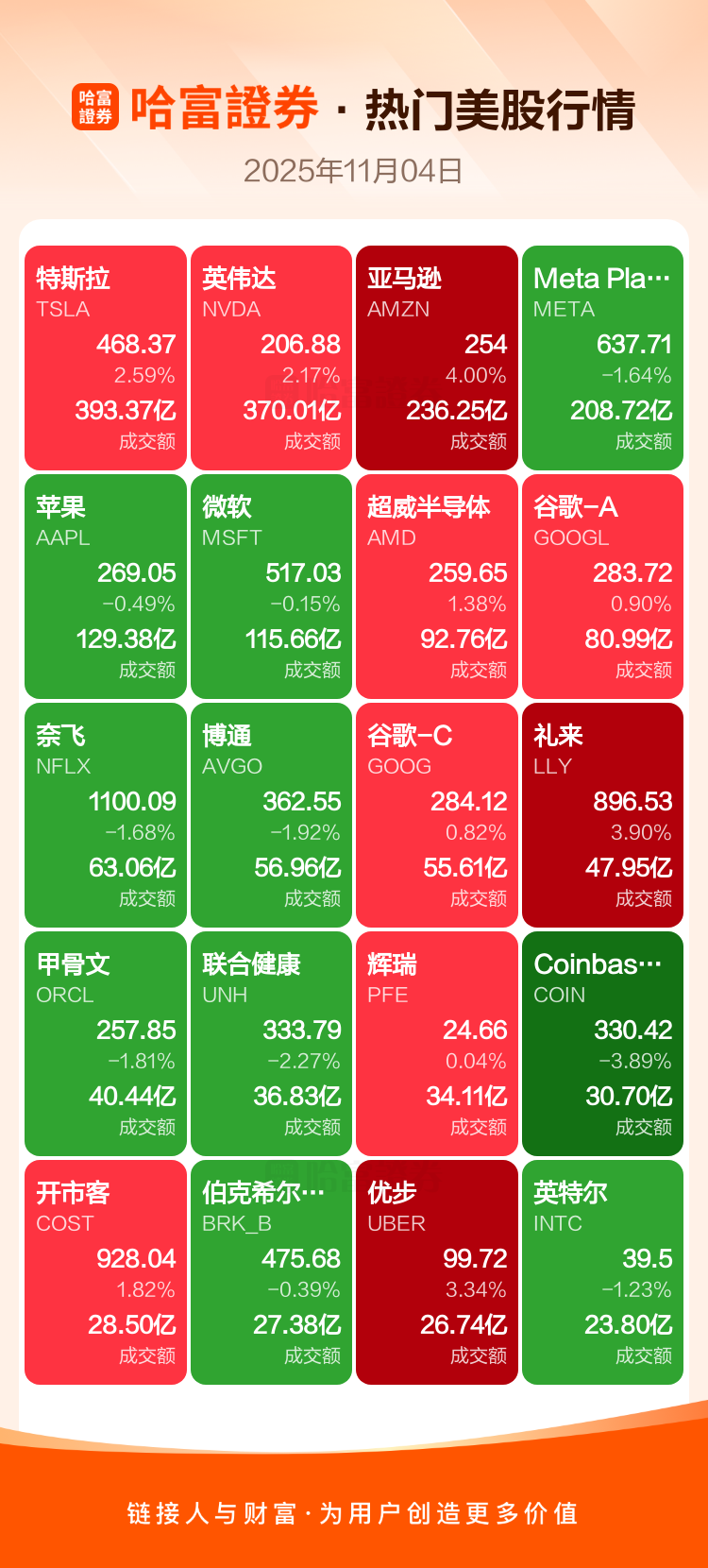 特斯拉涨2.59%,英伟达涨2.17%,亚马逊涨4.00%,Meta Platforms Inc-A跌1.64%,苹果跌0.49%,微软跌0.15%,超威半导体涨1.38%,谷歌-A涨0.90%,奈飞跌1.68%,博通跌1.92%。