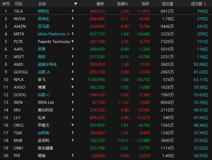 第13名IREN收高11.52%,成交55.59亿美元。微软公司已与澳大利亚企业IREN签署一项价值约97亿美元的协议,将向后者采购人工智能(AI)云算力,成为这家澳大利亚公司的最大客户。