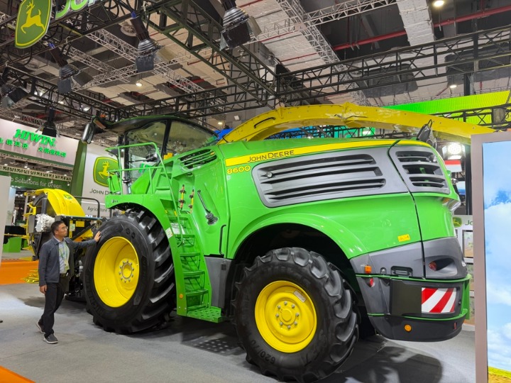走进技术装备展区,美国农业机械设备龙头企业约翰迪尔的展台“压迫感”十足,展品8600型号青贮机超3米的高度加上6米多的车身长度,几乎占满整个展台。
