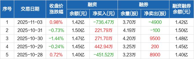 楚天高速:融资净偿还736.47万元,融资余额1.42亿元(11-03)