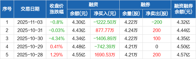 保隆科技融资融券信息显示,2025年11月3日融资净偿还1222.5万元;融资余额4.3亿元,较前一日下降2.76%