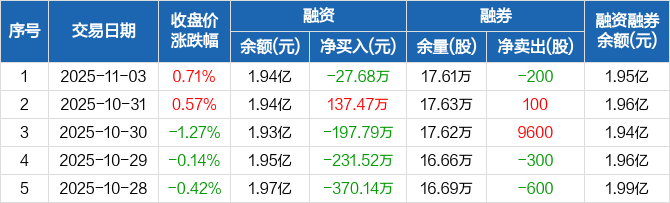贵州燃气:融资净偿还27.68万元,融资余额1.94亿元(11-03)
