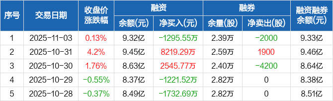 融资方面,当日融资买入1.48亿元,融资偿还1.61亿元,融资净偿还1295.55万元。融券方面,融券卖出0股,融券偿还2000股,融券余量2.39万股,融券余额109.84万元。融资融券余额合计9.33亿元。