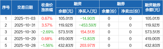 融资方面,当日融资买入26.9万元,融资偿还41.8万元,融资净偿还14.9万元。融券方面,融券卖出0份,融券偿还0份,融券余量0份,融券余额0元。融资融券余额合计105.01万元。