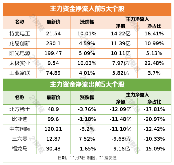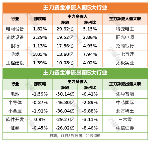 11月3日,市场探底回升,三大指数全线翻红。截至收盘,沪指涨0.55%,深成指涨0.19%,创业板指涨0.29%。沪深两市成交额2.11万亿,较上一个交易日缩量2107亿。