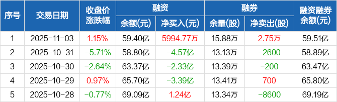 东山精密:融资净买入5994.77万元,融资余额59.4亿元(11-03)