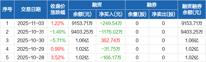 天振股份:融资净偿还249.54万元,融资余额9153.71万元(11-03)