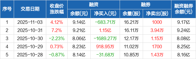 融资方面,当日融资买入2.44亿元,融资偿还2.5亿元,融资净偿还683.71万元。融券方面,融券卖出1.09万股,融券偿还9900股,融券余量16.21万股,融券余额364.56万元。融资融券余额合计9.17亿元。