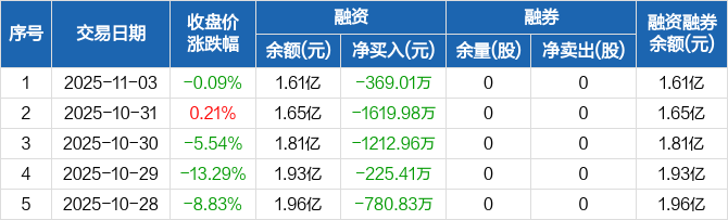 融资方面,当日融资买入1788.76万元,融资偿还2157.78万元,融资净偿还369.01万元,连续5日净偿还累计4208.21万元。融券方面,融券卖出0股,融券偿还0股,融券余量0股,融券余额0元。融资融券余额合计1.61亿元。
