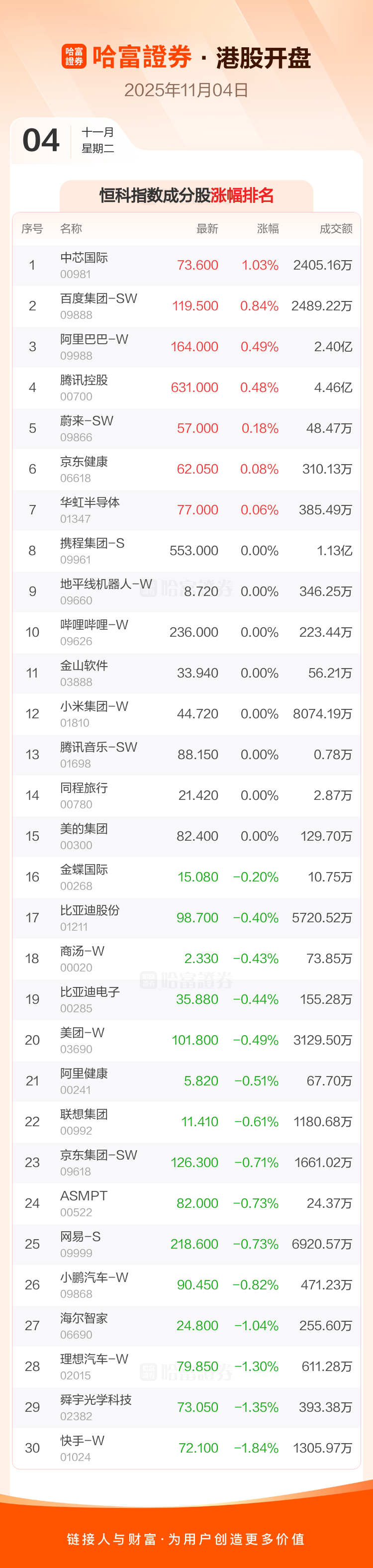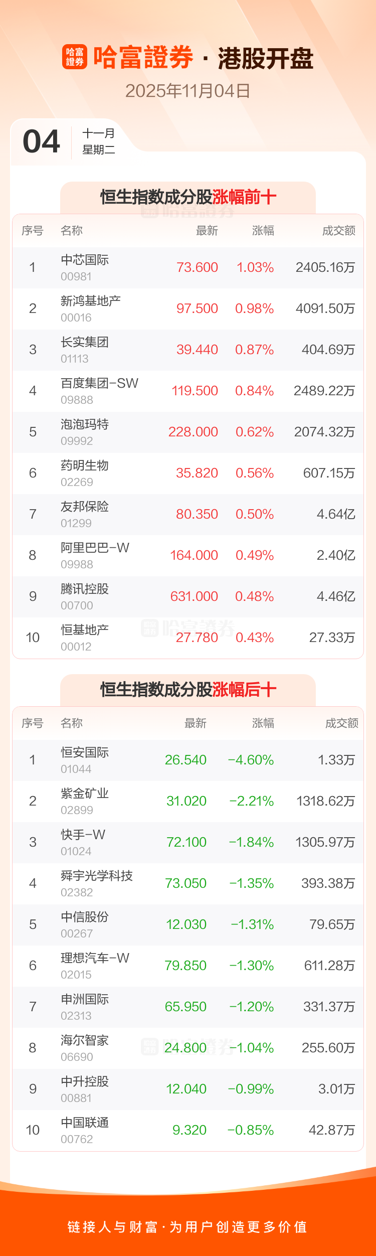 港股开盘:恒指低开0.04% 恒安国际领跌成分股