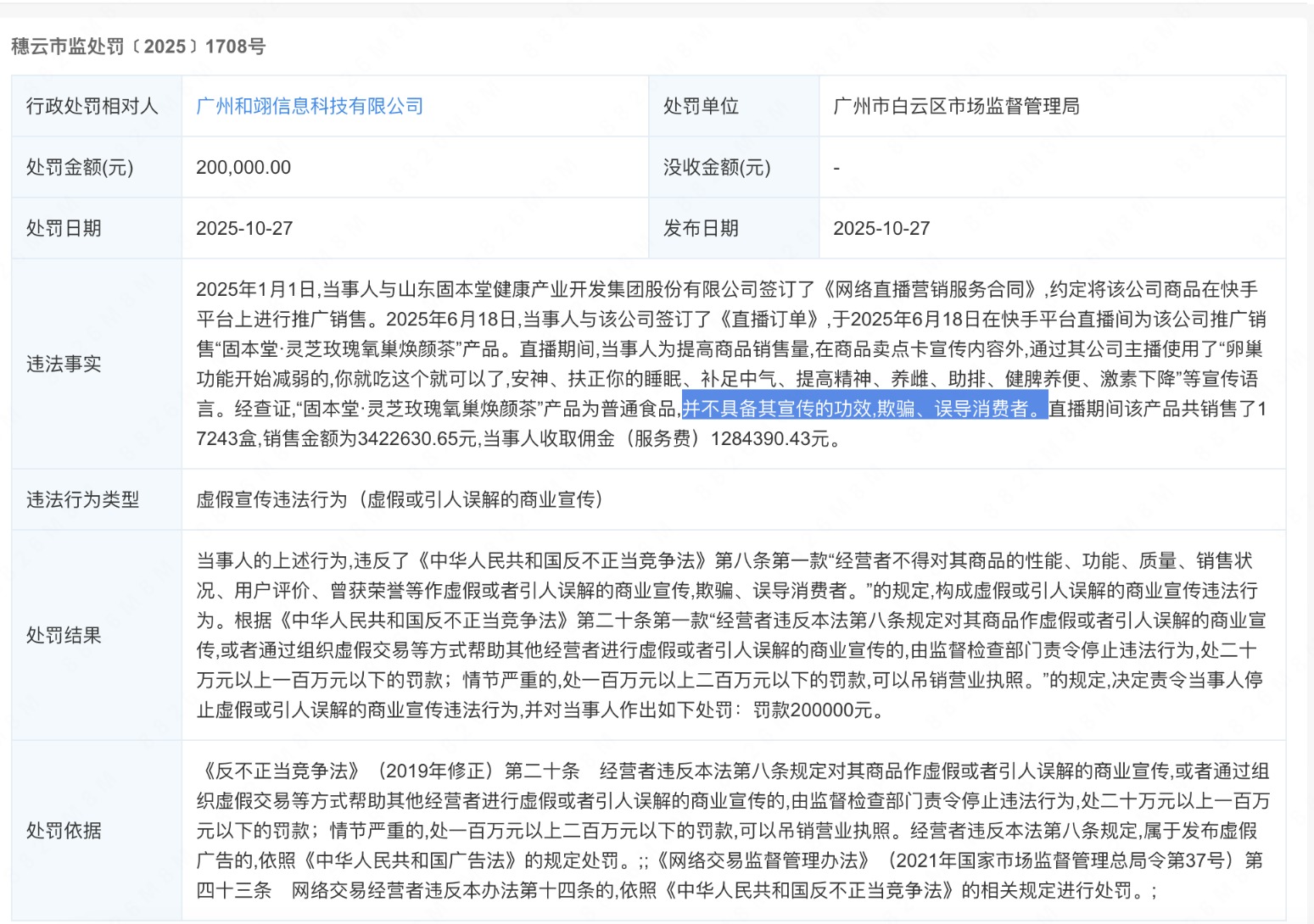 广州市白云区市场监督管理局查明,6月18日,广州和翊信息科技有限公司(下称“和翊信息”)在快手直播间推广销售“固本堂·灵芝玫瑰氧巢焕颜茶”产品时,为提高商品销售量,在商品卖点卡宣传内容外,通过其公司主播使用了“卵巢功能开始减弱的,你就吃这个就可以了,安神、扶正你的睡眠、补足中气、提高精神、养雌、助排、健脾养便、激素下降”等宣传语言。经查证,该产品为普通食品,并不具备其宣传的功效,涉及欺骗、误导消费者。直播期间该产品共销售了1.72万余盒,销售金额为342万余元,当事人收取佣金(服务费)128万余元。