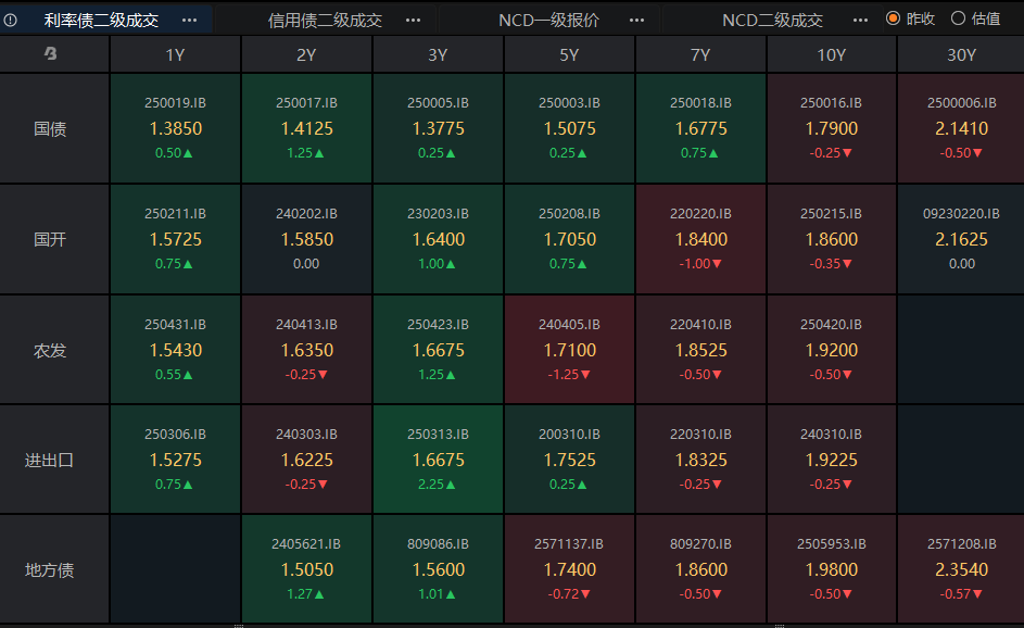 截至今日18点,利率市场收益率多数小幅上行,1Y国债上行0.5bp至1.39%,3Y国债上行0.25bp至1.38%,5Y国债上行0.25bp至1.51%,10Y国债下行0.25bp至1.79%,30Y国债下行0.5bp至2.14%,10Y国开下行0.35bp至1.86%。信用市场收益率多数震荡,2Y期AAA信用债上行1bp至1.68%,3Y期AAA信用债下行1.5bp至1.92%,5Y期AAA信用债收益率持平至2.18%。转债方面,中证转债指数今日收盘报486点,收涨0.19%。