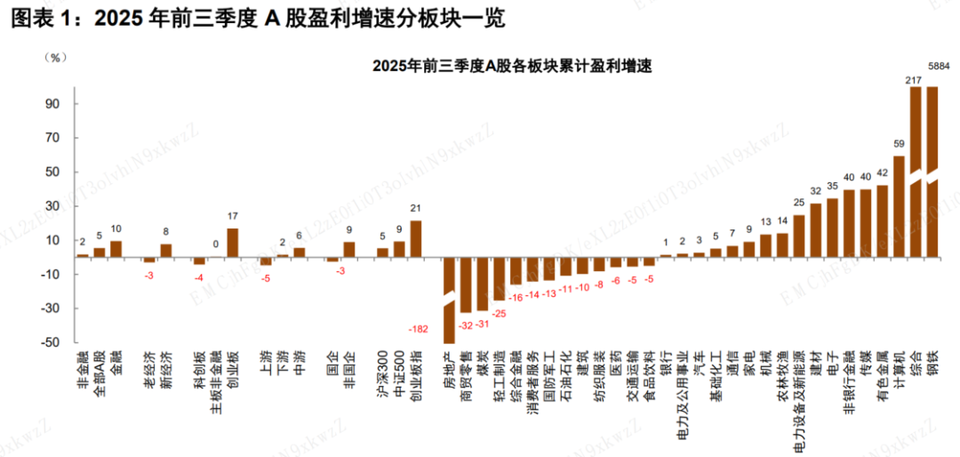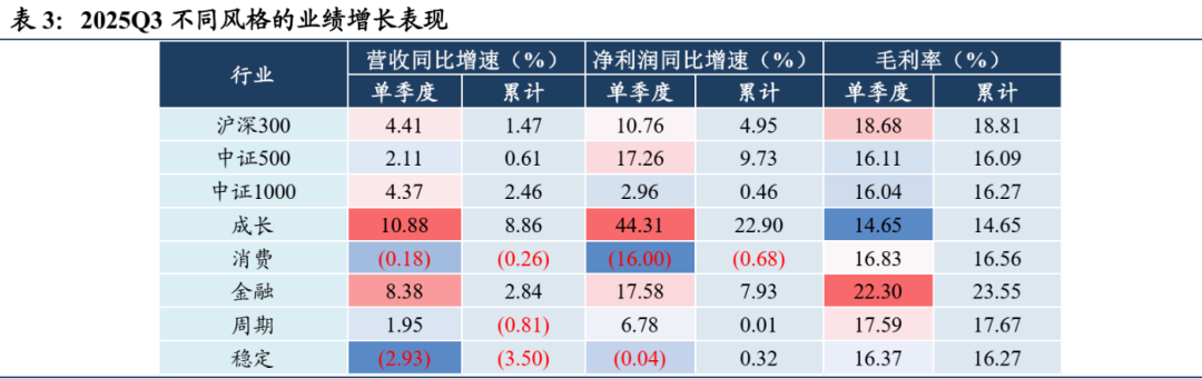 2025Q3总量业绩增速继续回升,结构上,科技成长增速仍然占优,但出海与反内卷推动景气线索加速扩散。大中盘业绩弹性突出,推动盈利增长进入复苏周期。1)科技成长:受益全球AI资本开支趋势,电子/通信设备等硬件环节延续高增长;2)周期:反内卷推动周期品毛利率普遍改善,钢铁/有色/化工增速居前;3)消费:增速普遍承压,龙头压力较大,如白酒/白电/化学制药等;4)大金融:资本市场交投活跃与增量资金入市,证券/保险业绩延续高增;银行增速韧性较强。