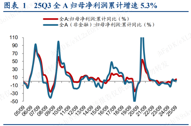 2025年前三季度A股公司盈利同比增长5.4%,非金融盈利同比增1.7%。行业层面,盈利改善行业增多,TMT板块、有色金属及部分中游领域表现较好。我们建议结合产能周期视角,关注电池、有色金属、创新药、消费电子、光学光电、养殖业等;从出海机遇并结合估值的视角,关注工程机械、电网设备、商用车、白色家电等行业。