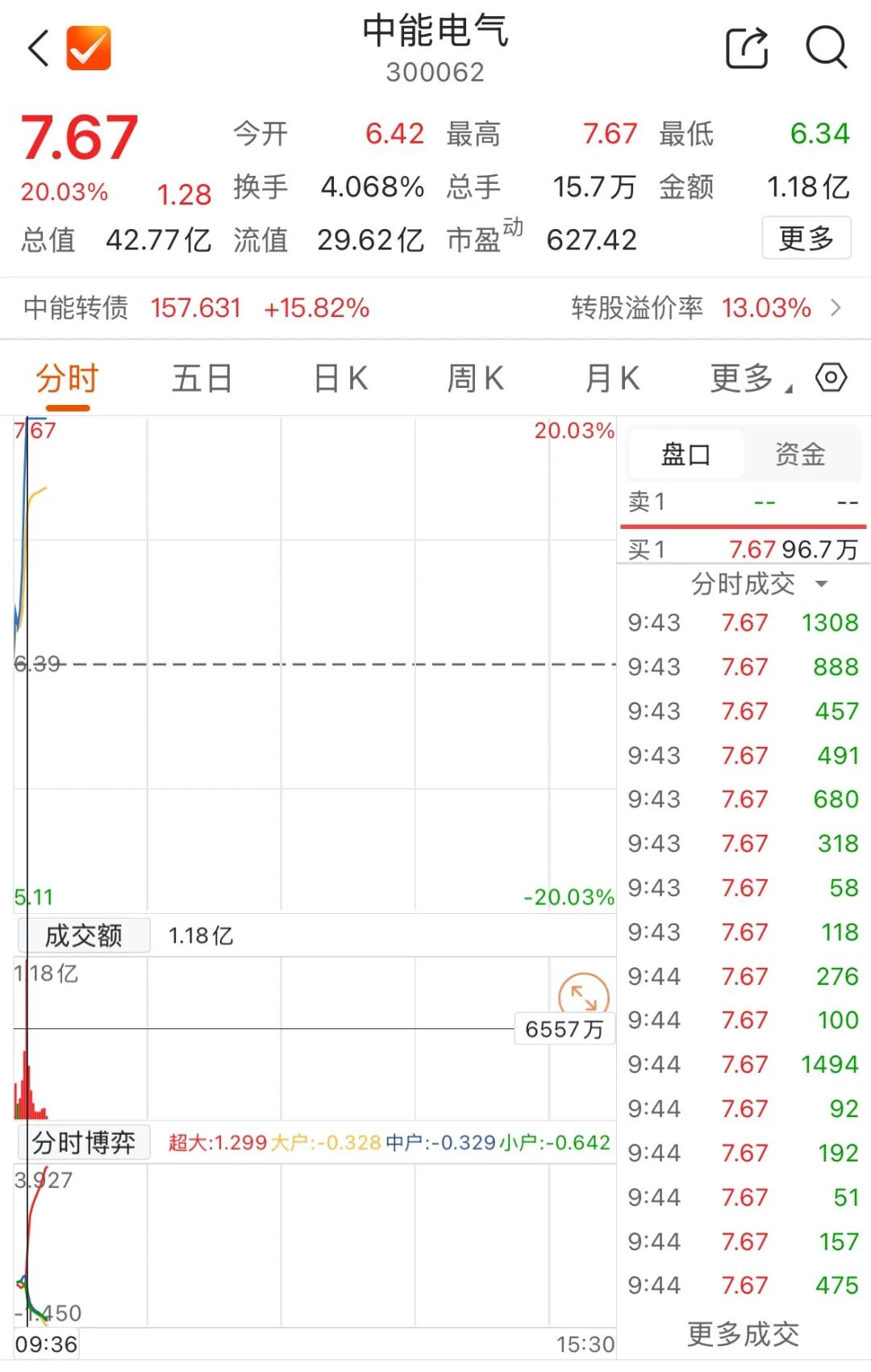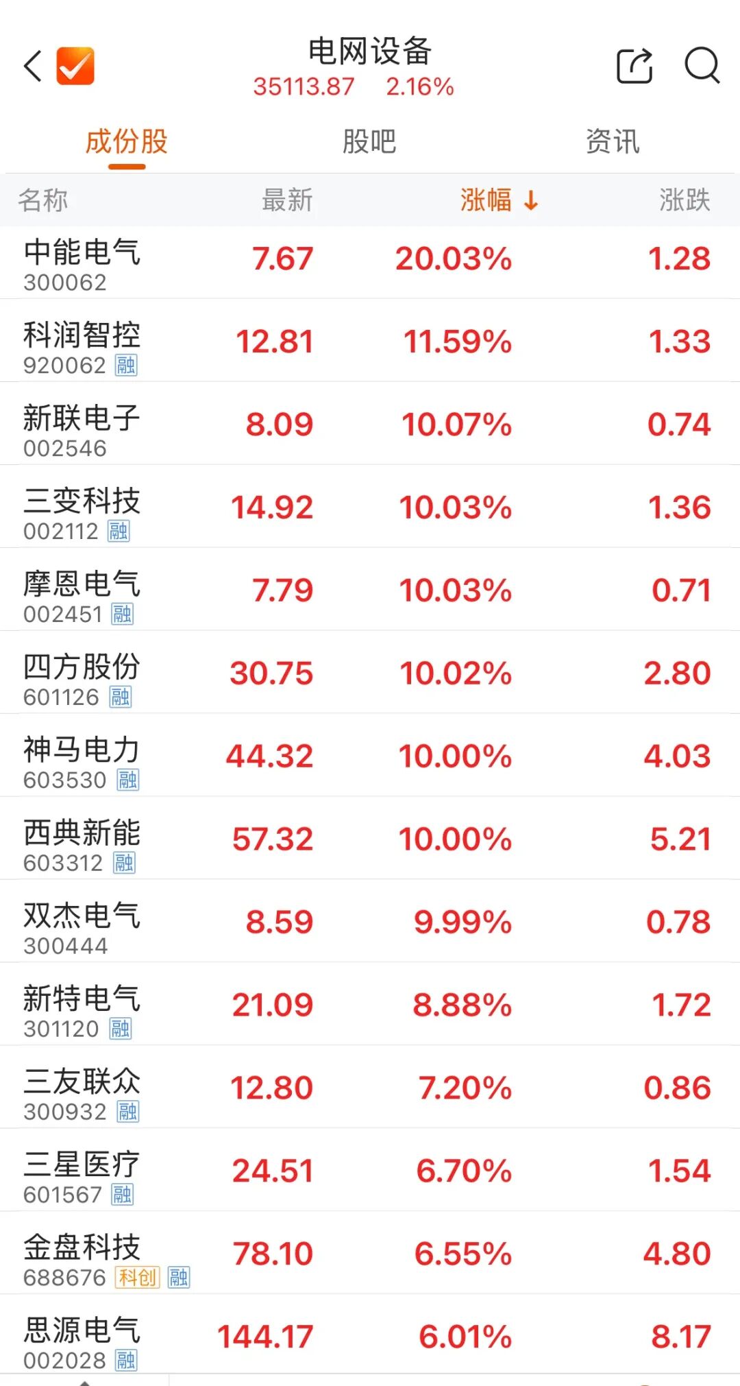 电网设备板块走强,中能电气开盘6分钟“20cm”涨停。截至发稿,板块内新联电子、三变科技、神马电力、西典新能等多只个股涨停。