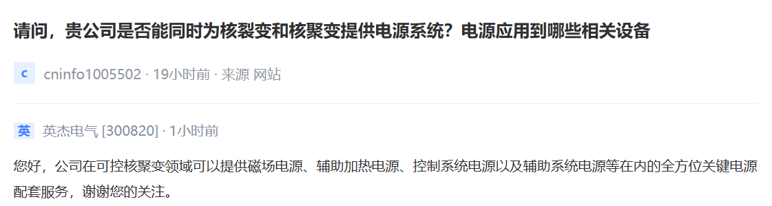 英杰电气:公司在可控核聚变领域可提供全方位关键电源配套服务