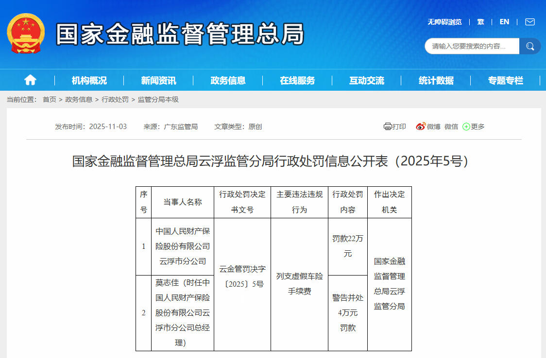 11月3日 ,据国家金融监督管理总局云浮监管分局行政处罚信息公开表显示,因列支虚假车险手续费,中国人民财产保险股份有限公司云浮市分公司被罚款22万元。