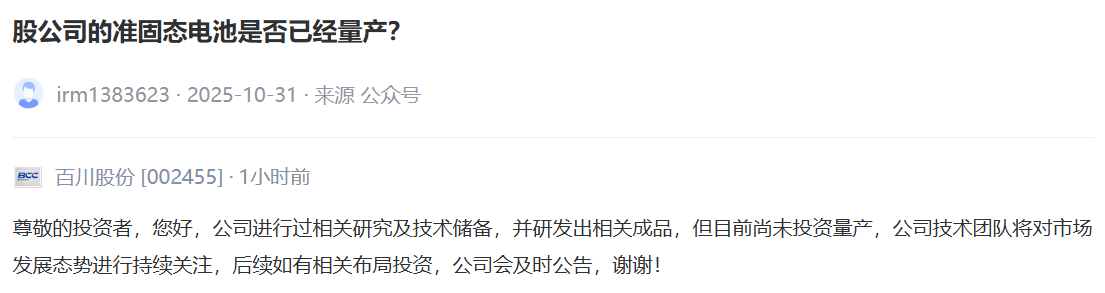 百川股份:已研发准固态电池的相关成品 尚未投资量产