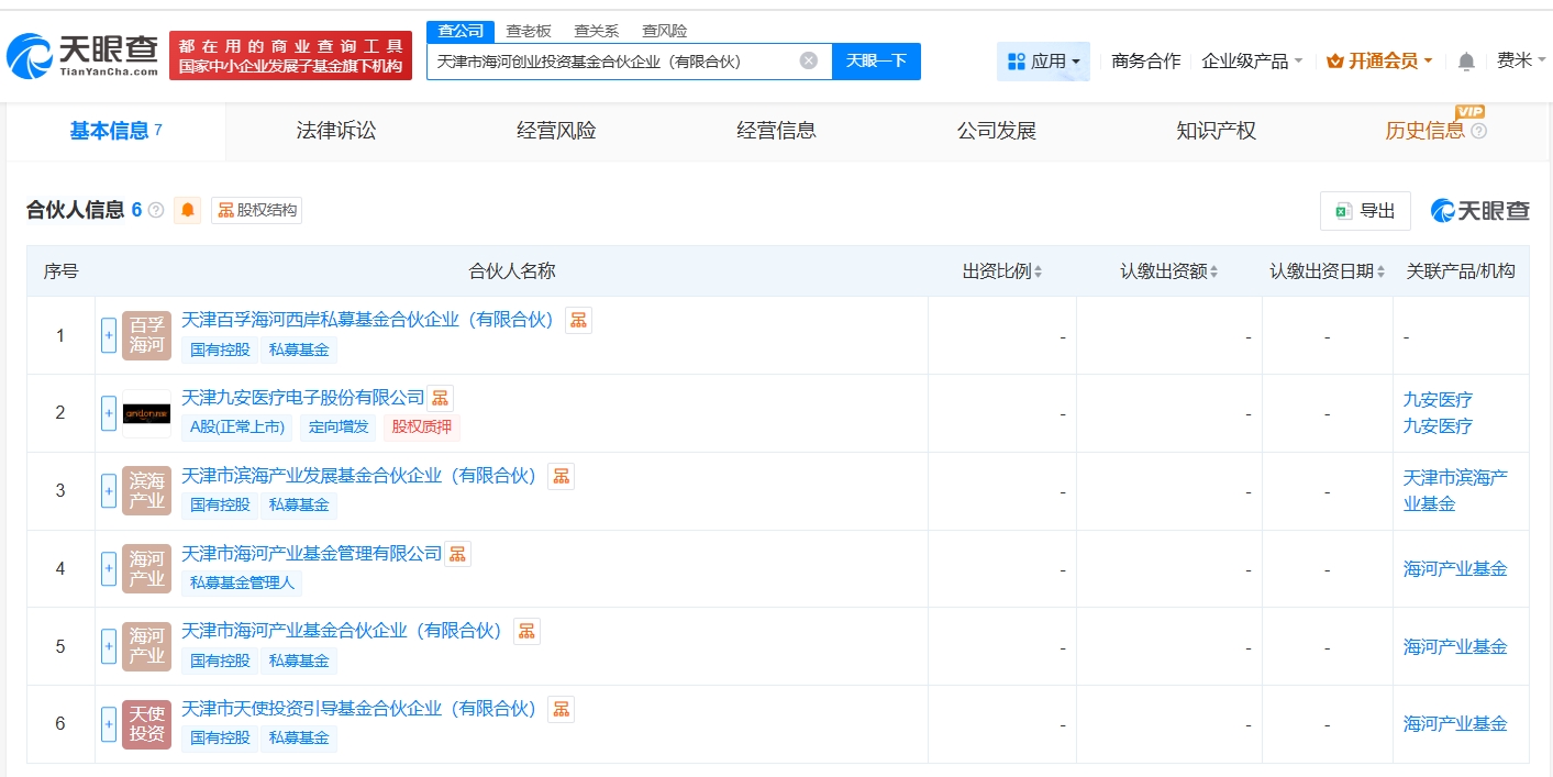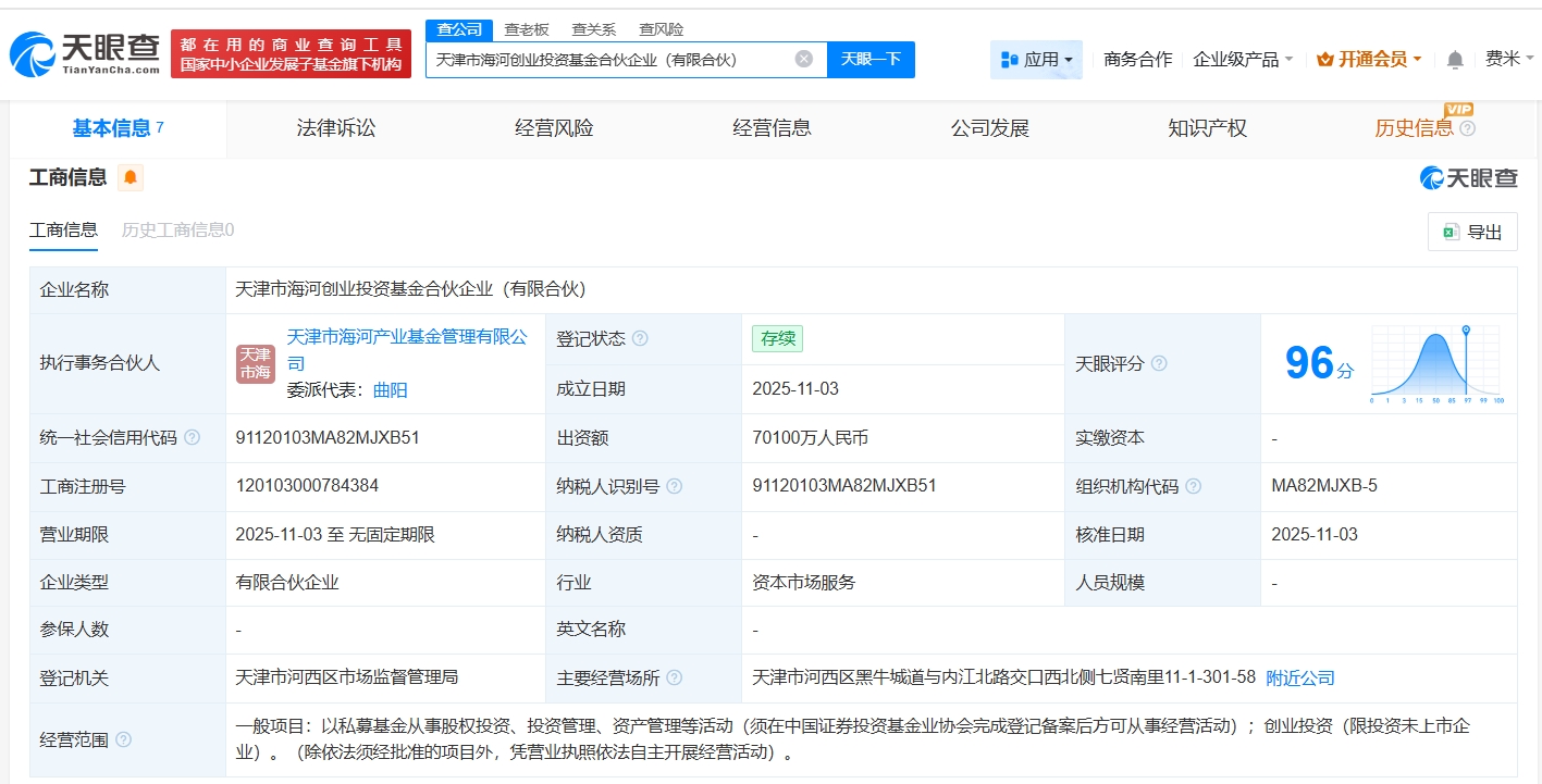 每经AI快讯,天眼查工商信息显示,近日,天津市海河创业投资基金合伙企业(有限合伙)成立,执行事务合伙人为天津市海河产业基金管理有限公司,出资额7.01亿元人民币,经营范围为以私募基金从事股权投资、投资管理、资产管理等活动,创业投资。合伙人信息显示,该基金由天津百孚海河西岸私募基金合伙企业(有限合伙)、天津市滨海产业发展基金合伙企业(有限合伙)、九安医疗(002432)等共同出资。