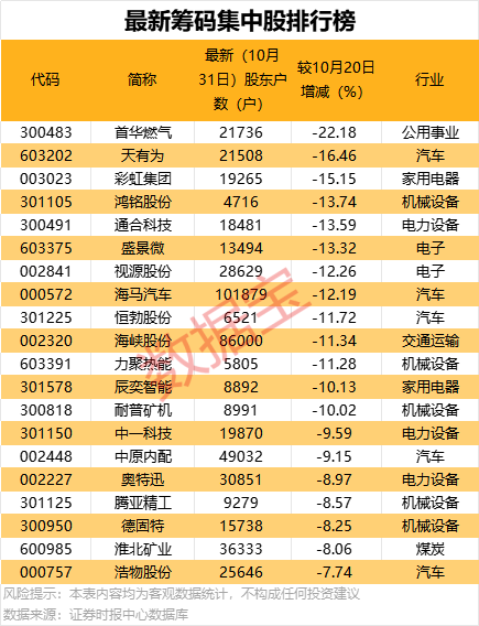 股东户数降幅最多的是首华燃气,截至10月31日股东户数为21736户,较10月20日下降22.18%;其次是天有为、彩虹集团,股东户数环比分别下降16.46%、15.15%。