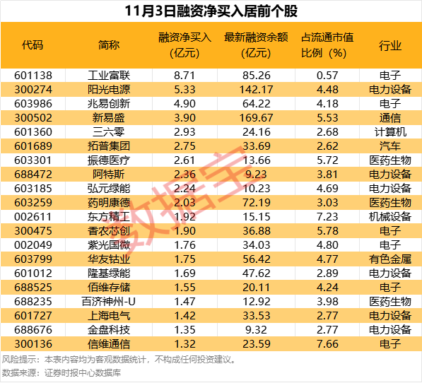 具体到个股,11月3日获融资净买入千万元以上的有583只,其中35只融资净买入额超1亿元。工业富联融资净买入额居首,当日净买入8.71亿元;其次是阳光电源、兆易创新,融资净买入金额分别为5.33亿元、4.90亿元,融资净买入金额居前的还有新易盛、三六零、拓普集团等。