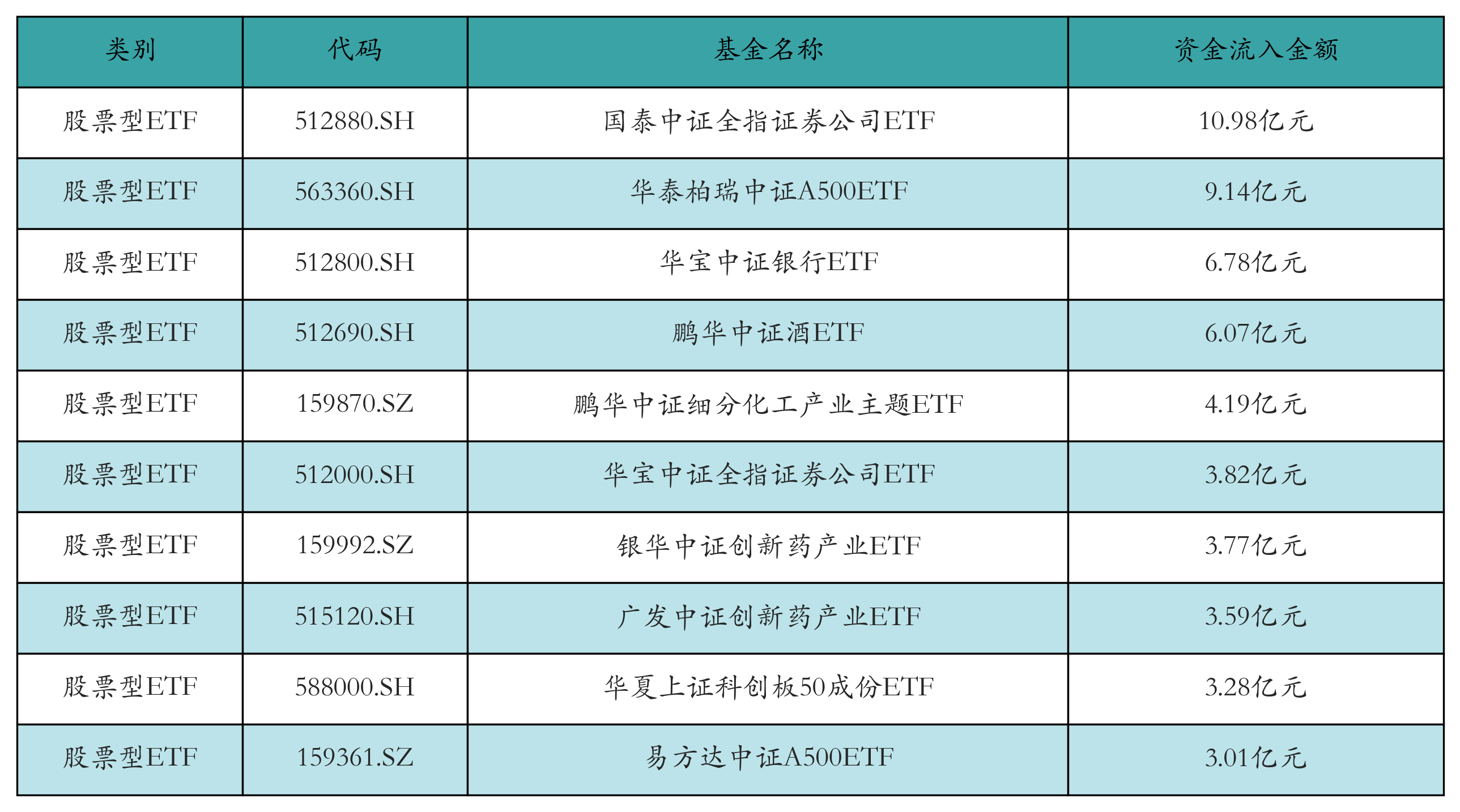 昨日股票型ETF资金流入最多的3只ETF及其流入金额分别为:国泰中证全指证券公司ETF(流入10.98亿元)、华泰柏瑞中证A500ETF(流入9.14亿元)、华宝中证银行ETF(流入6.78亿元)。资金流入前10详情见下表: