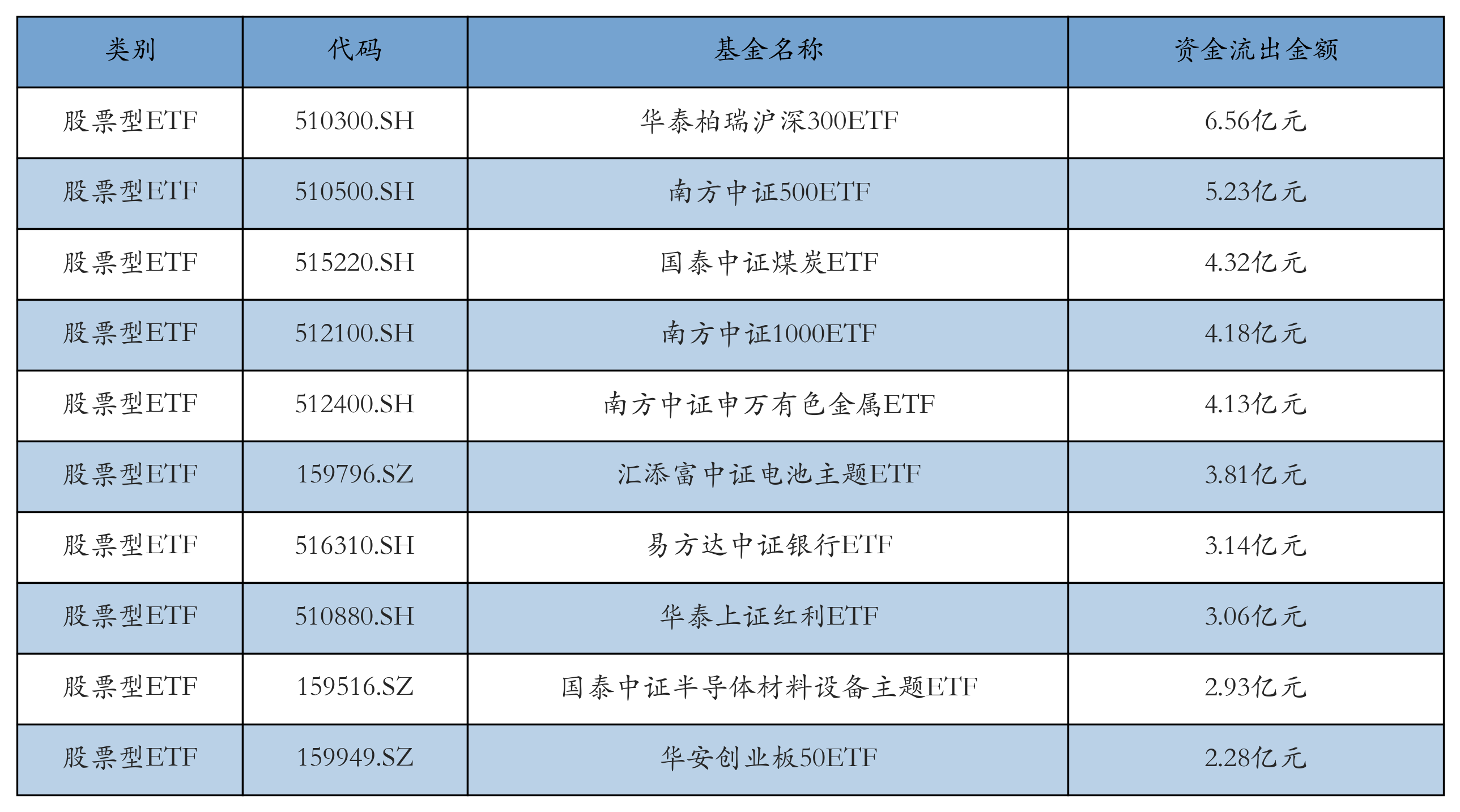 昨日股票型ETF资金流出最多的3只ETF及其流出金额分别为:华泰柏瑞沪深300ETF(流出6.56亿元)、南方中证500ETF(流出5.23亿元)、国泰中证煤炭ETF(流出4.32亿元)。资金流出前10详情见下表: