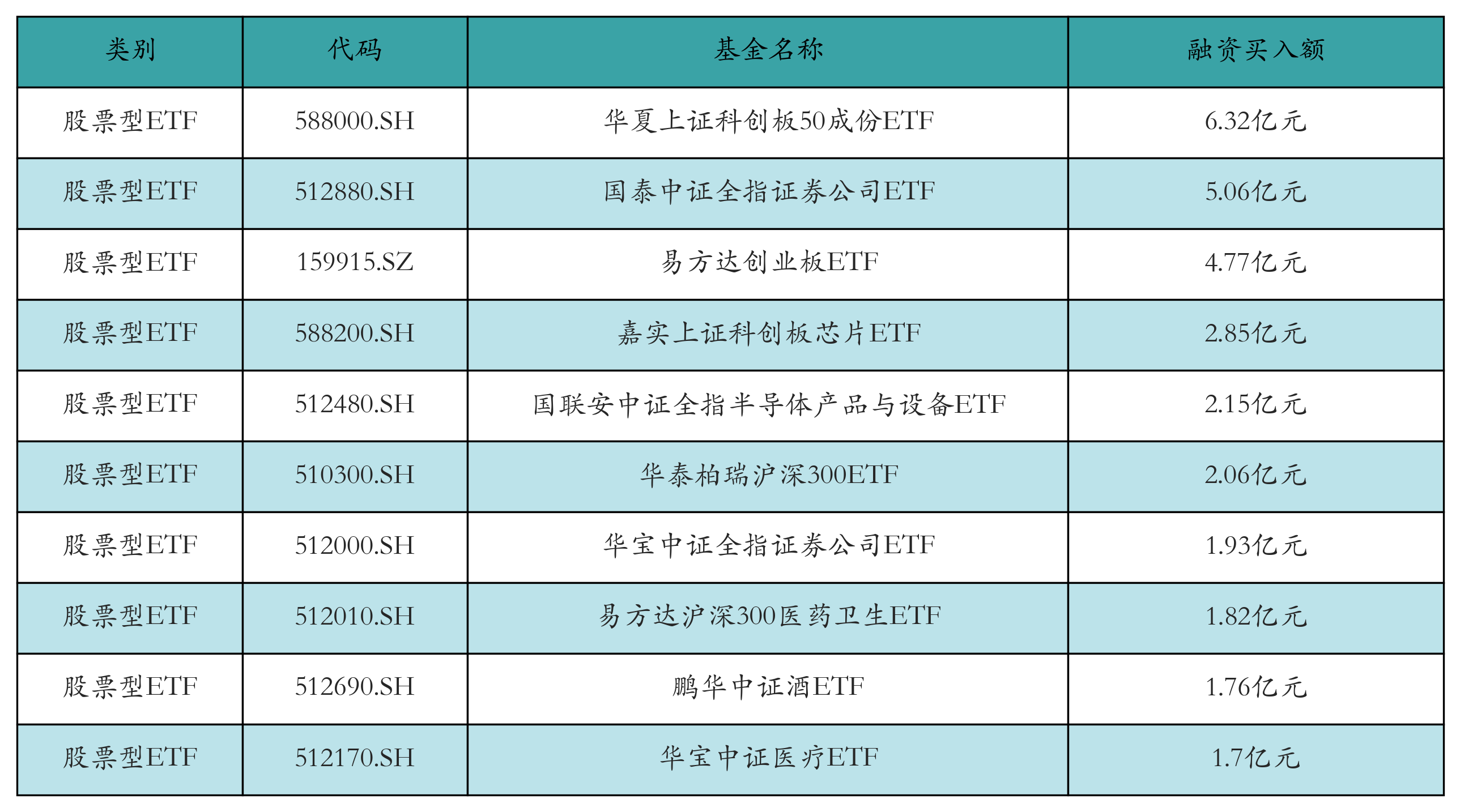 昨日股票型ETF融资买入额最高的3只ETF及其买入金额分别为:华夏上证科创板50成份ETF(6.32亿元)、国泰中证全指证券公司ETF(5.06亿元)、易方达创业板ETF(4.77亿元)。融资买入额前10详情见下表: