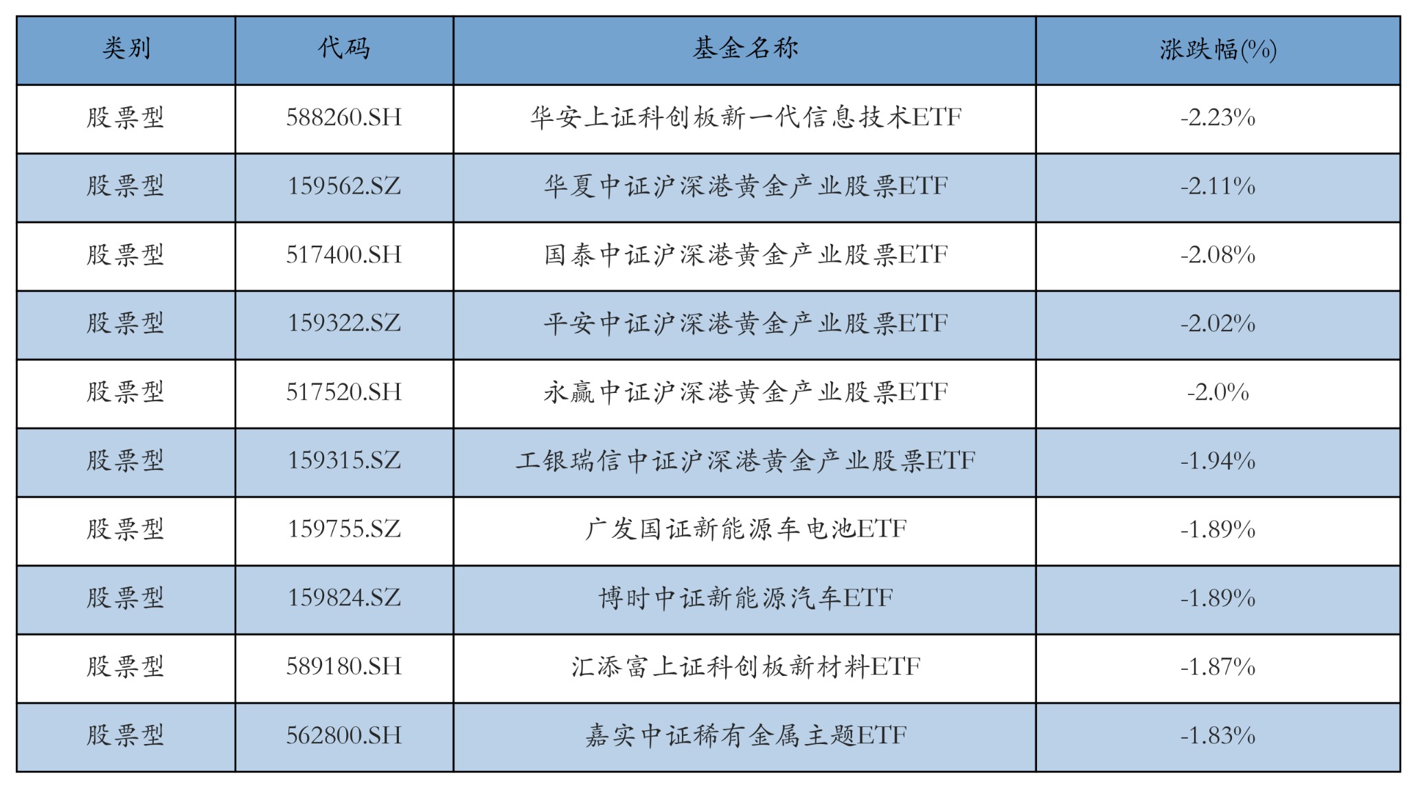 昨日股票型ETF跌幅最大的3只ETF及其收益率分别为:华安上证科创板新一代信息技术ETF(-2.23%)、华夏中证沪深港黄金产业股票ETF(-2.11%)、国泰中证沪深港黄金产业股票ETF(-2.08%)。跌幅前10详情见下表: