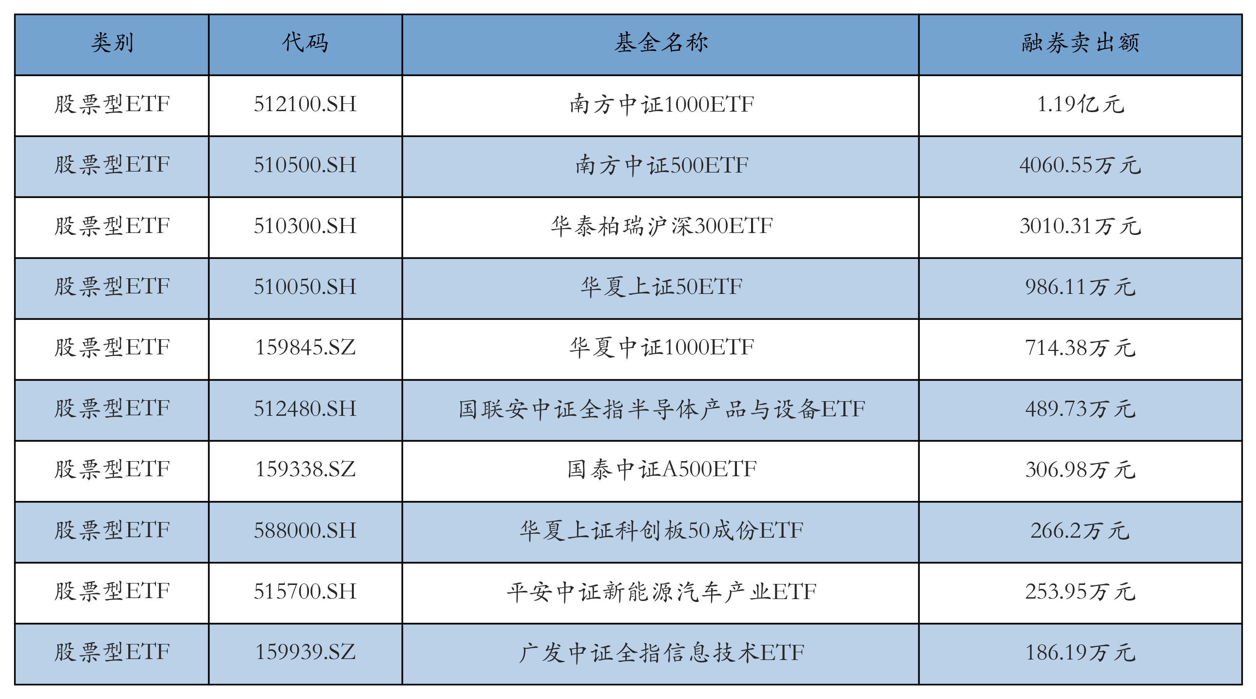 昨日股票型ETF融资卖出额最高的3只ETF及其卖出金额分别为:南方中证1000ETF(1.19亿元)、南方中证500ETF(4060.55万元)、华泰柏瑞沪深300ETF(3010.31万元)。融券卖出额前10详情见下表: