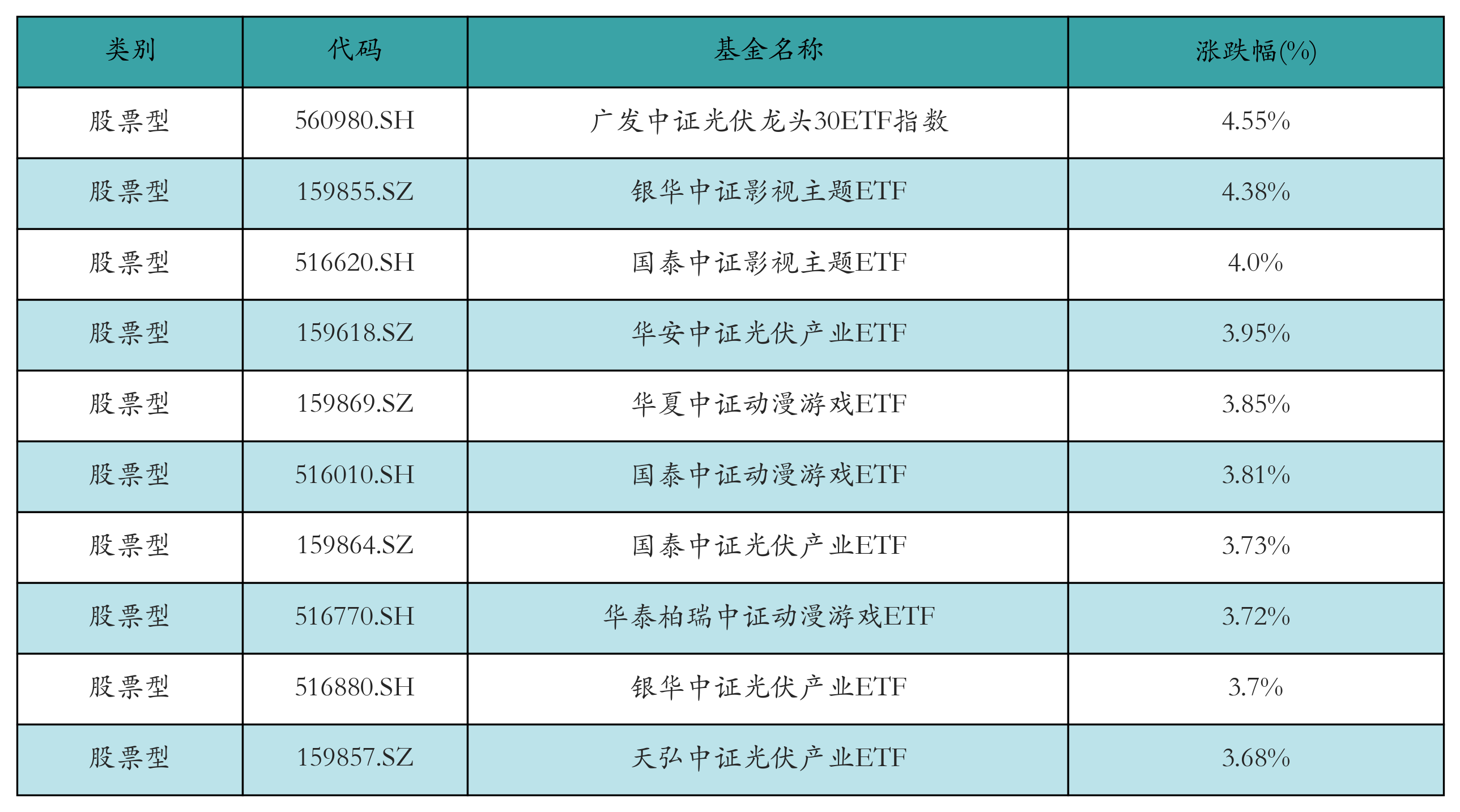 昨日股票型ETF涨幅最高的3只ETF及其收益率分别为:广发中证光伏龙头30ETF指数(4.55%)、银华中证影视主题ETF(4.38%)、国泰中证影视主题ETF(4.0%)。涨幅前10详情见下表: