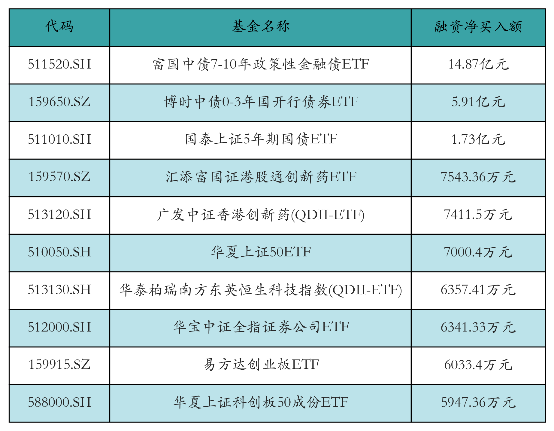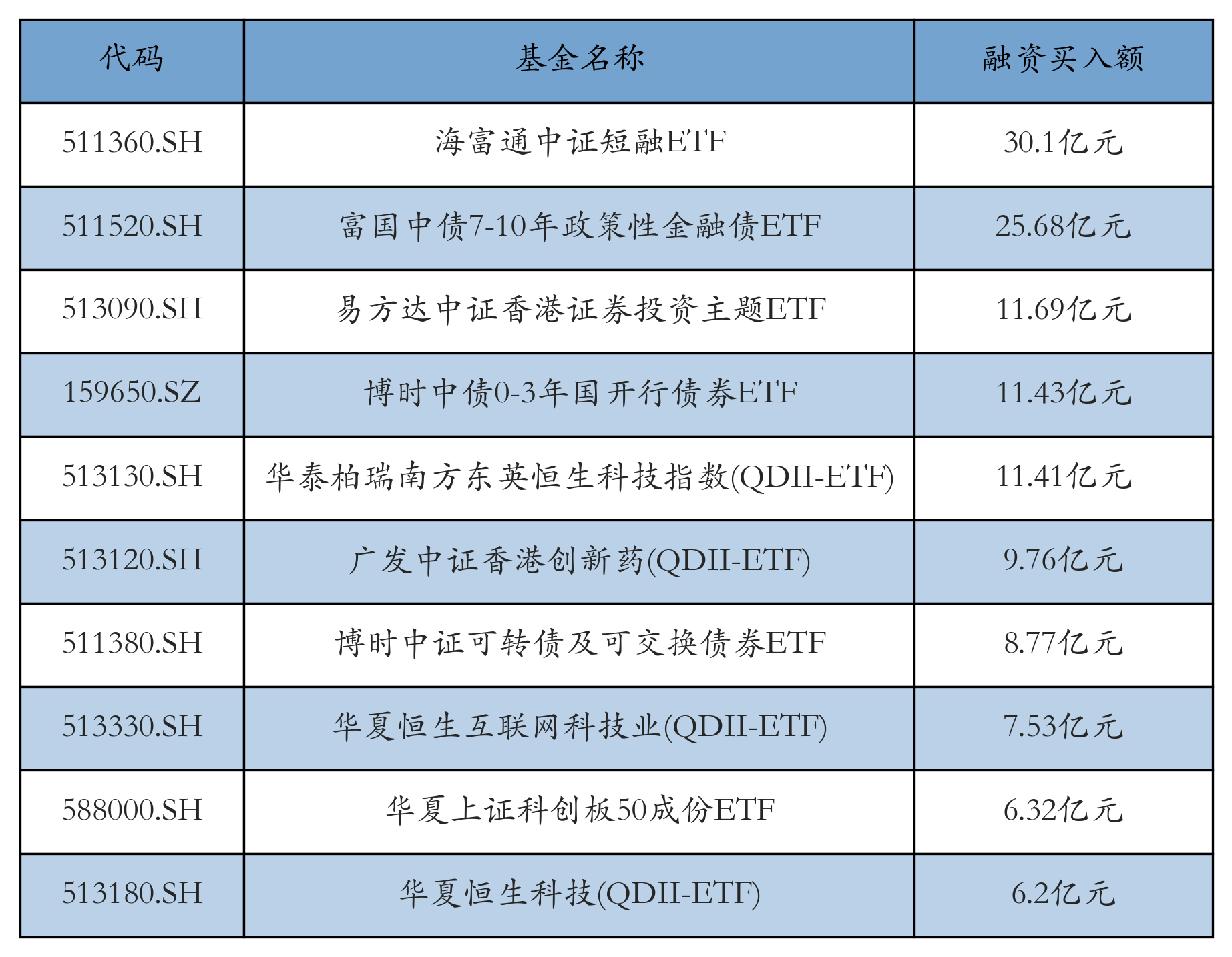 11月3日ETF融资买入额前三位分别为:海富通中证短融ETF(30.1亿元)、富国中债7-10年政策性金融债ETF(25.68亿元)和易方达中证香港证券投资主题ETF(11.69亿元),前10具体见下表: