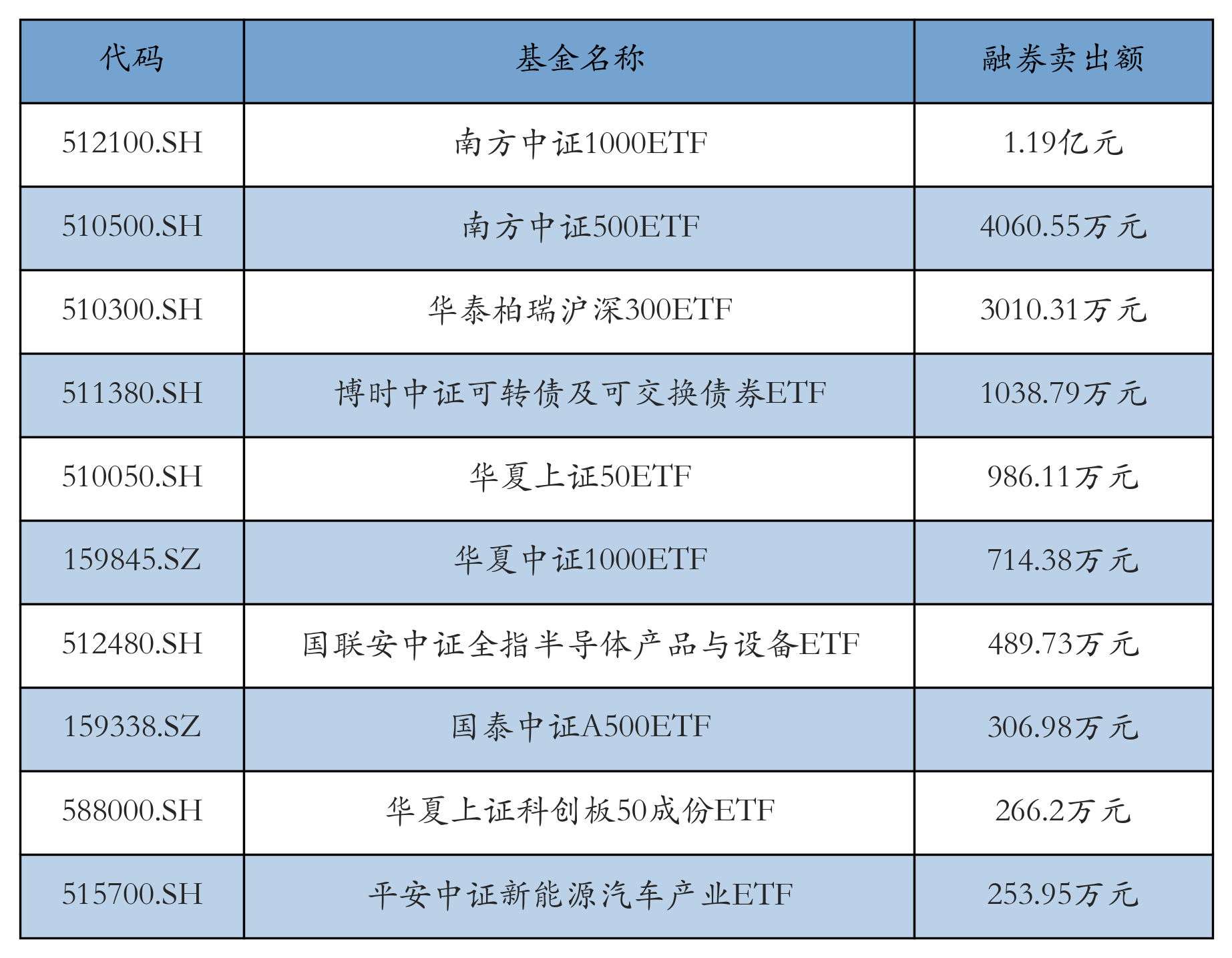 11月3日ETF融券卖出额前三位分别为:南方中证1000ETF(1.19亿元)、南方中证500ETF(4060.55万元)和华泰柏瑞沪深300ETF(3010.31万元),前10具体见下表: