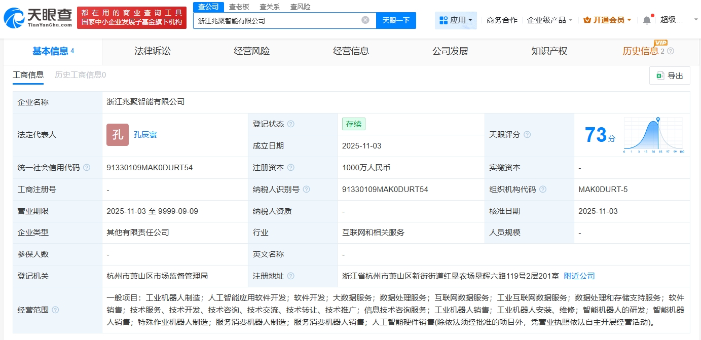 南方财经11月4日电,天眼查工商信息显示,近日,浙江兆聚智能有限公司成立,法定代表人为孔辰寰,注册资本1000万人民币,经营范围包括工业机器人制造、人工智能应用软件开发、大数据服务、数据处理服务、互联网数据服务等。股东信息显示,该公司由兆丰股份(300695)、乐聚智能(深圳)股份有限公司共同持股。
