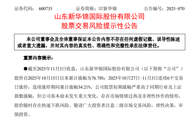 ST新华锦11月3日公告,公司股价已连续6个交易日涨停,累计涨幅34.21%,严重高于同期行业及上证指数涨幅。公司基本面未发生重大变化,存在市场情绪过热及非理性炒作的情形,股价随时存在快速下跌风险。