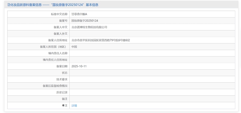 新京报贝壳财经记者查询化妆品新原料备案信息了解到,甘草查尔酮A的备案人为北京诺博特生物科技有限公司(以下简称“诺博特”),系爱美客全资子公司。