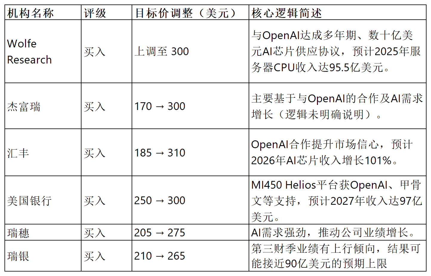 机构目标价普遍上调。核心看多逻辑高度一致,主要围绕与OpenAI的深度合作、AI芯片需求的强劲增长以及新产品的市场潜力。