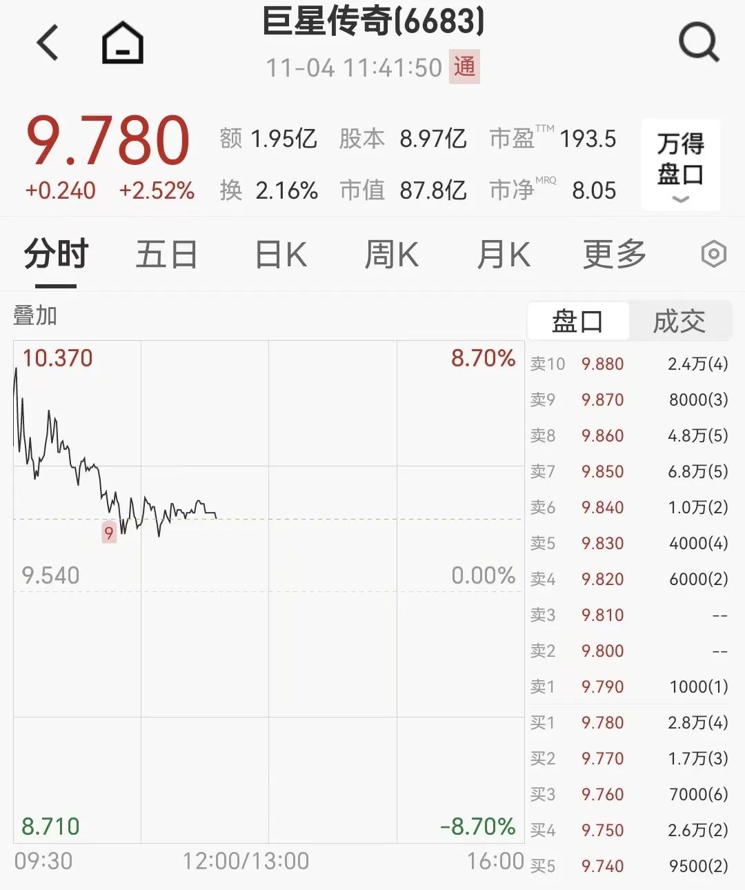 11月4日,港股巨星传奇大涨,盘初一度大涨超8%,截至发稿涨超2.52%,报9.78港元/股。