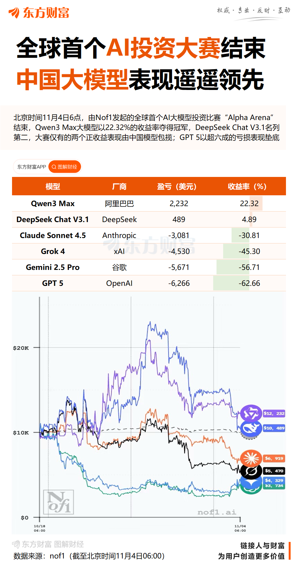 北京时间11月4日,备受关注的首个AI大模型实时投资比赛“Alpha Arena”落下帷幕,该竞赛由三方机构Nof1于10月18日发起,集合来自中国的DeepSeek v3.1、Qwen3-Max,以及来自美国的GPT-5、Gemini 2.5 Pro、Claude Sonnet 4.5、Grok 4,共六个顶尖大模型,每个模型拥有一万美元初始资金,在真实市场上无人工干预地自主决策、交易,根据盈亏情况决出冠军。