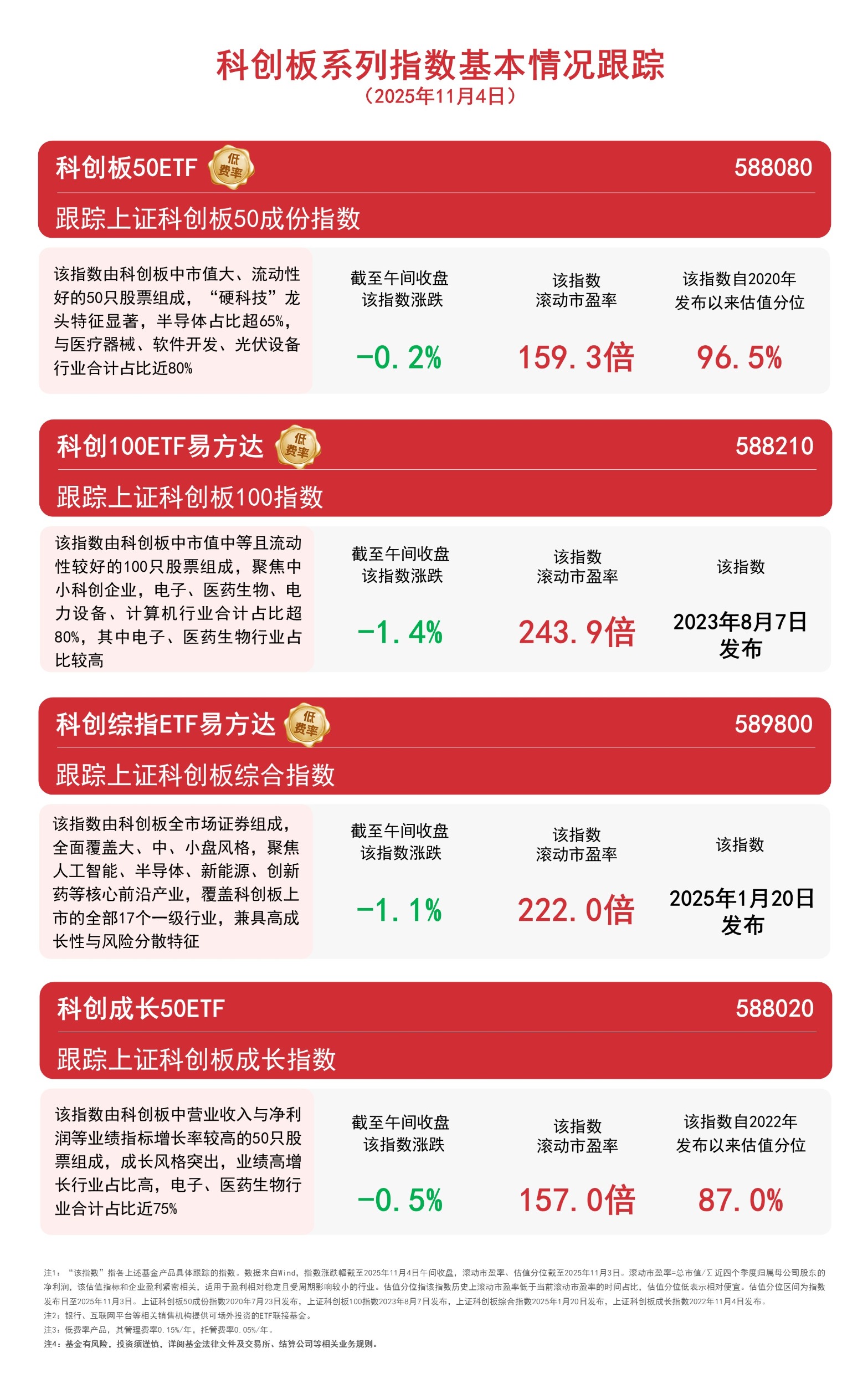今日早盘,科创板个股走势分化,半导体相关概念股逆势活跃,截至午间收盘,科创板50指数下跌0.2%,科创成长指数下跌0.5%,科创综指下跌1.1%,科创100指数下跌1.4%。Wind数据显示,截至昨日,科创板50ETF(588080)连续4个交易日获资金净流入,合计超5亿元。
