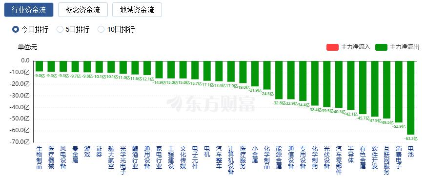 净流出方面,电池、消费电子、互联网服务等净流出排名靠前,其中电池净流出63.28亿元。