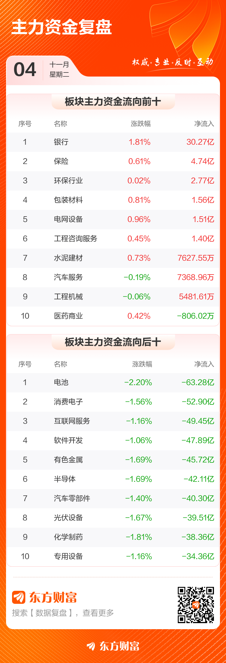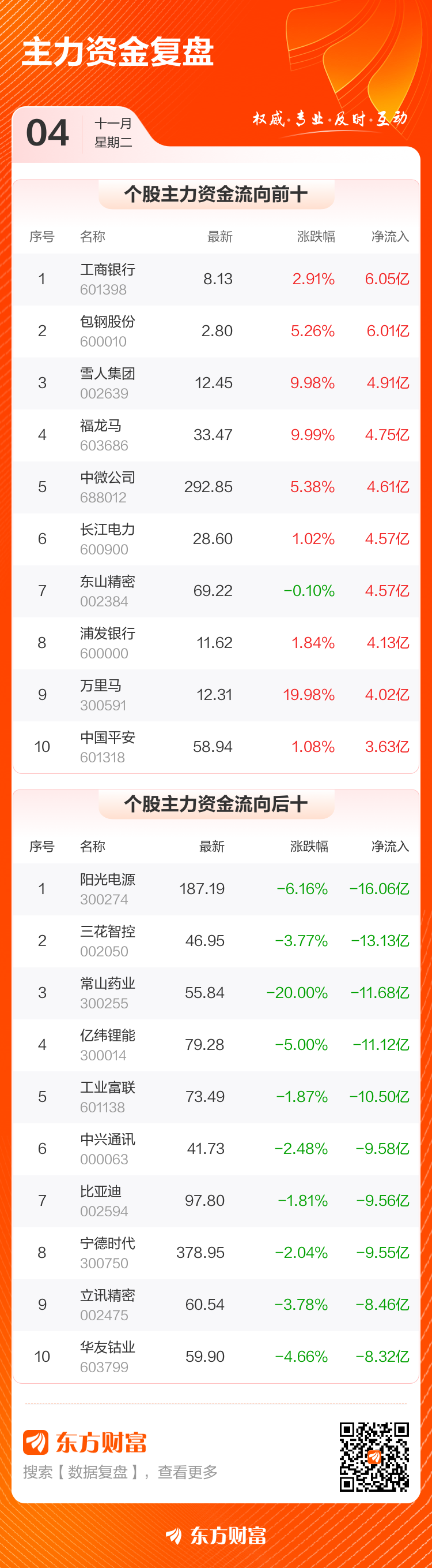 主力复盘:6.05亿流入工商银行 16.06亿出逃阳光电源