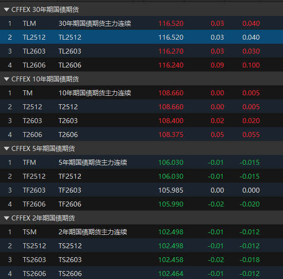 11月4日,国债期货收盘涨跌互现,30年期主力合约涨0.03%,报116.520元,10年期主力合约持平,报108.660元,5年期主力合约跌0.01%,报106.030元,2年期主力合约跌0.01%,报102.498元。