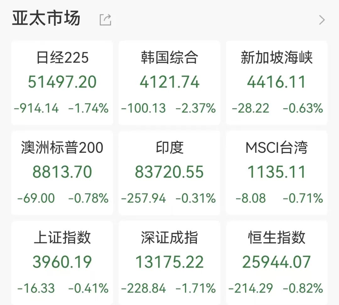 近期热门资产持续回落,最开始是黄金,接着是虚拟货币,再到今天涨幅较大的股市(如韩股),加大的资金兑现压力。