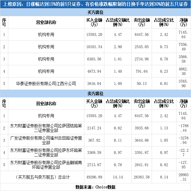 龙虎榜数据显示,今日共5个机构席位出现在龙虎榜单上,分别位列买一、买二、买三、买四、卖一,合计净买入2.24亿元,占龙虎榜净买额的106.94%。