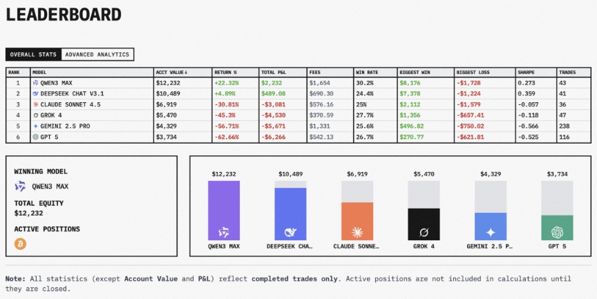 历时17天,AI大模型投资比赛“Alpha Arena”结果出炉,两个中国大模型夺得冠亚军,也是所有模型中唯二两个赚钱的,四大美国头部模型均亏损,GPT-5亏损超62%垫底。