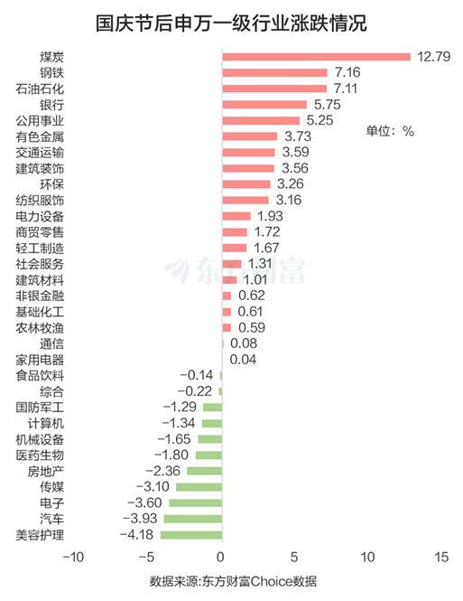 事实上,国庆假期之后,包括银行股在内的高股息资产便持续强势。从申万一级行业来看,东方财富Choice数据显示,国庆假期后涨幅前五的行业分别是煤炭、钢铁、石油石化、银行和公用事业,涨幅分别为12.79%、7.16%、7.11%、5.75%和5.25%。