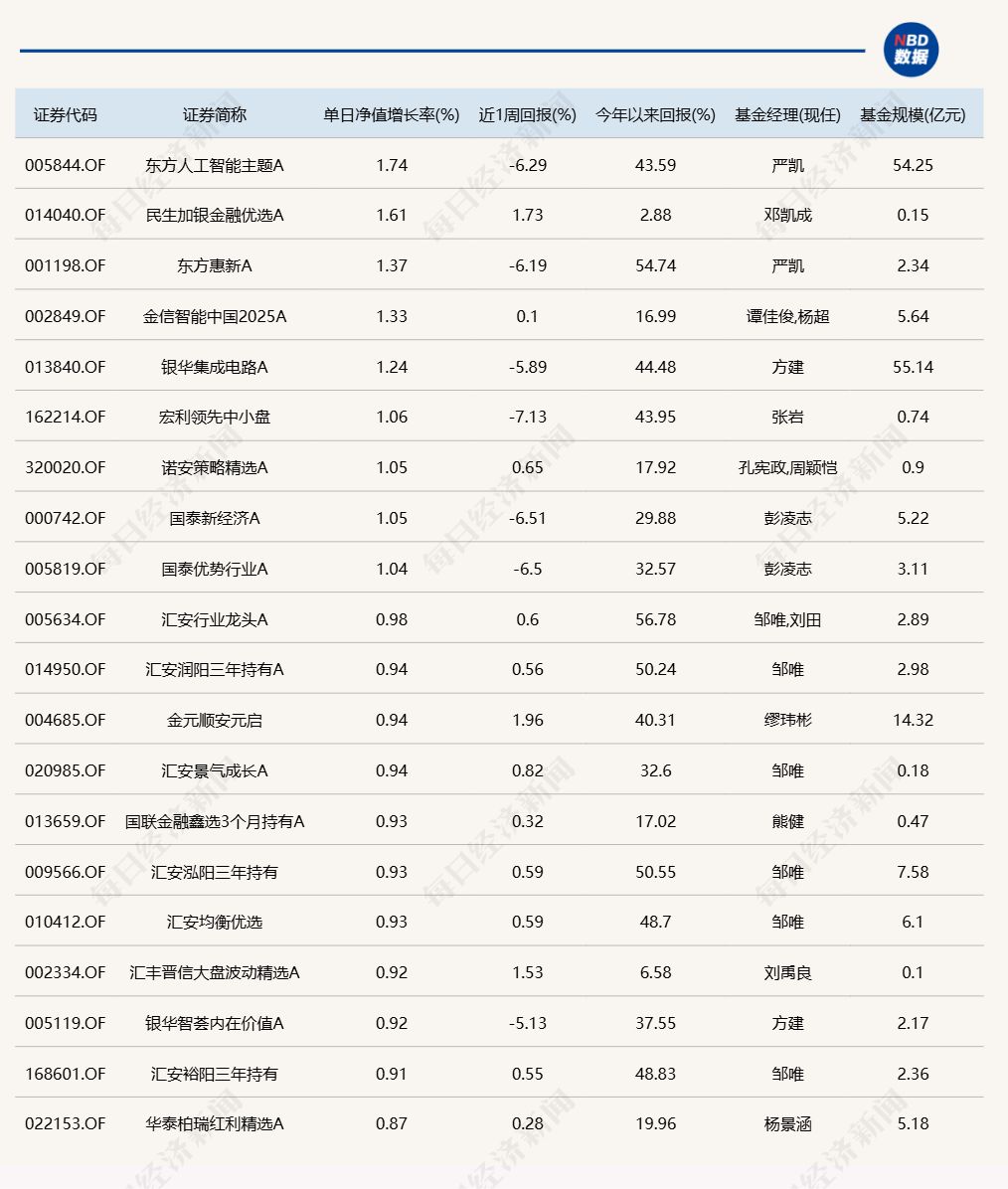 点评:今天在主动基金中排第一的东方人工智能主题,放到全市场来看,实际上输给了18只银行主题的被动指数型产品(含ETF、联接基金),排在第19名。