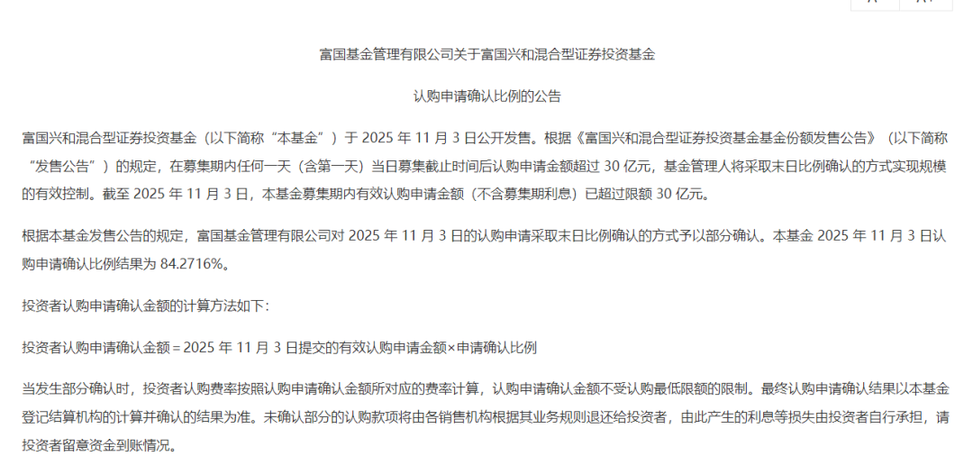 11月3日发行的富国兴和混合基金,首日认购资金也超过30亿元。11月4日,富国基金公告称,截至11月3日,富国兴和混合基金募集期内有效认购申请金额(不含募集期利息)已超过限额30亿元。对11月3日的认购申请采取末日比例确认的方式予以部分确认,认购申请确认比例结果为84.27%。
